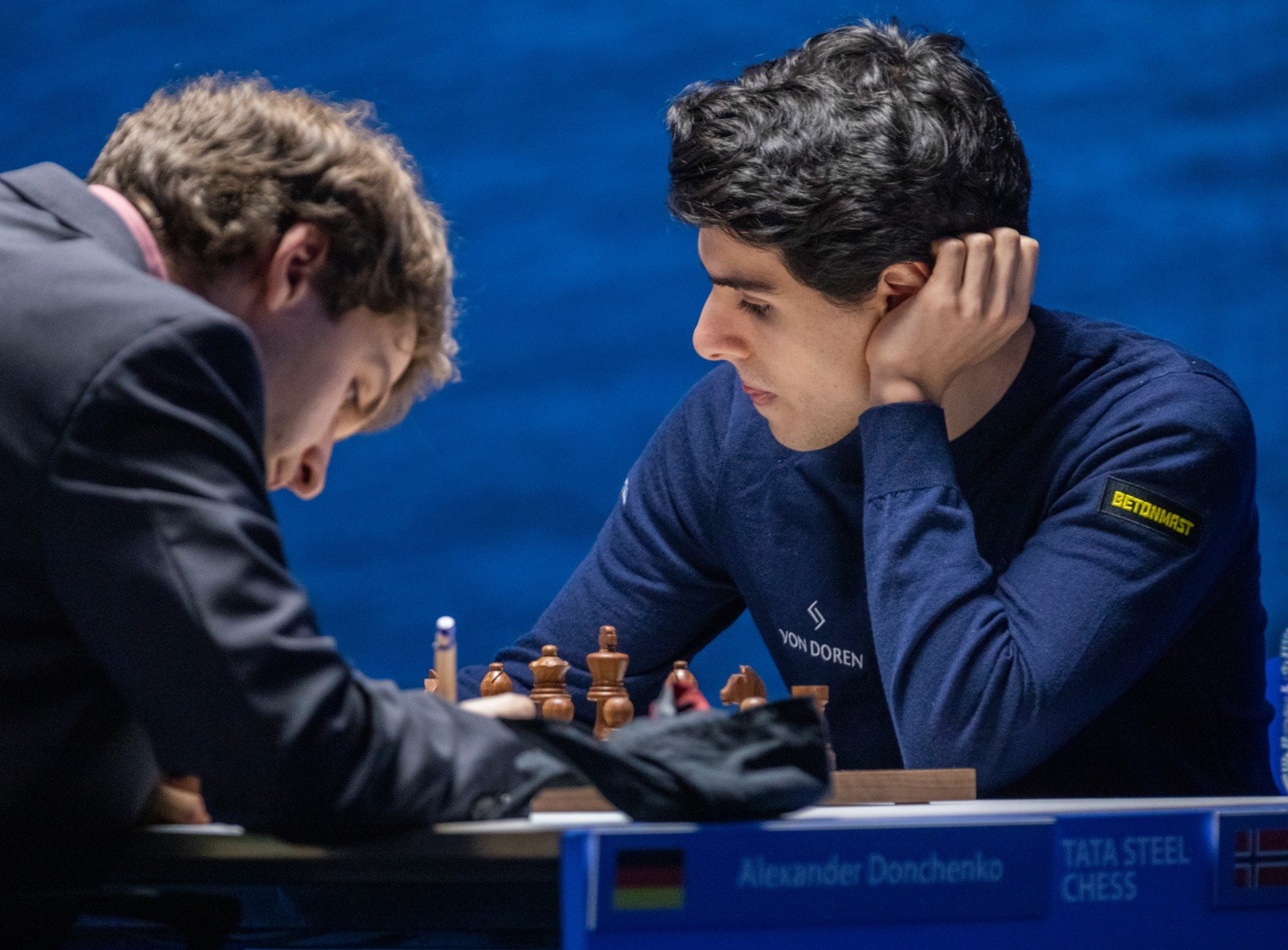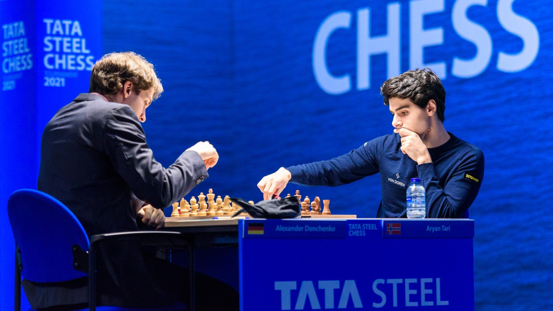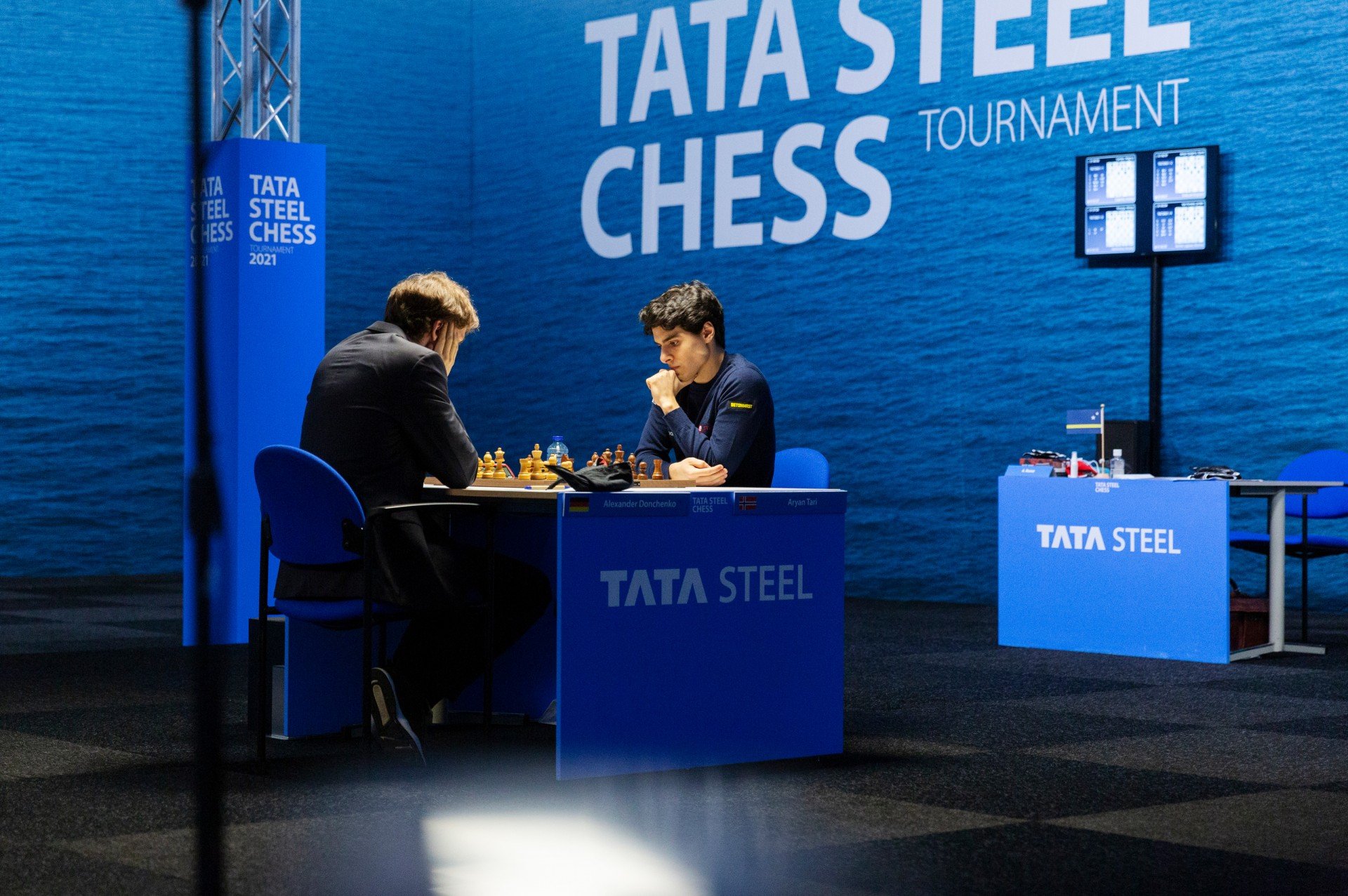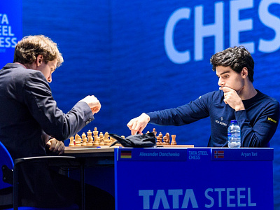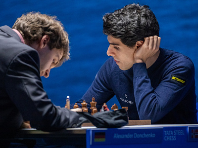 Очень аккуратно играли Александр Донченко и Арьян Тари в известном варианте Каталонского начала. Партия перешла в примерно равный эндшпиль и без волнений принесла соперникам по половинке очка.